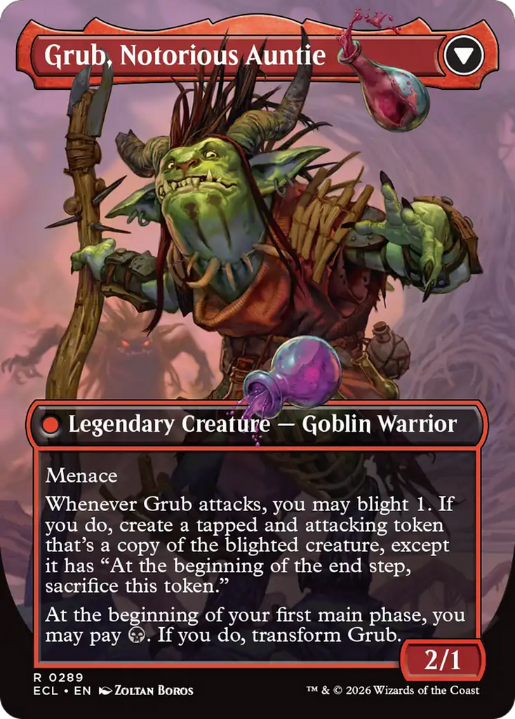 Whenever Grub attacks, you may blight 1. If you do, create a tapped and attacking token that’s a copy of the blighted creature, except it has “At the beginning of the end step, sacrifice this token.”